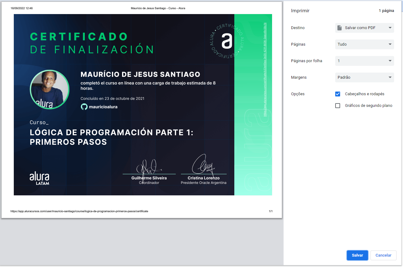 2. Clique no botão “Salvar” e escolha onde quer deixar seu certificado como PDF salvo.